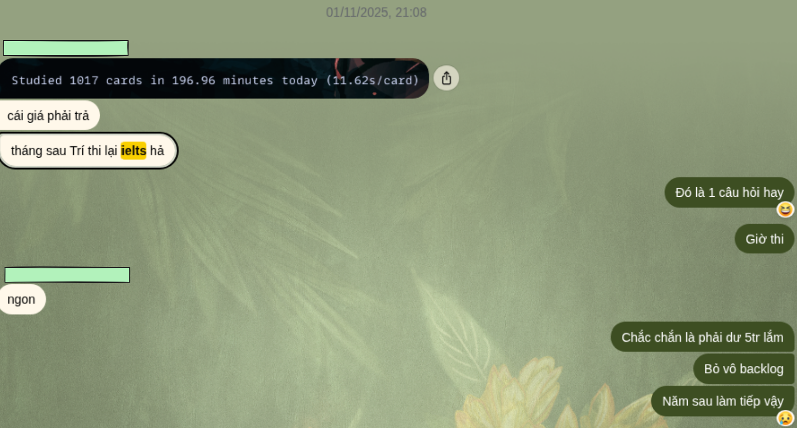 Hồi lúc mới thi IELTS xong (tháng 8 tháng 9 gì đó năm 2024), mình có một cái plan là tốt nghiệp với tấm bằng IELTS 8.0 trên tay. Lúc đó có đầu tư thời gian học tiếp để tháng 6 thi thiệt.